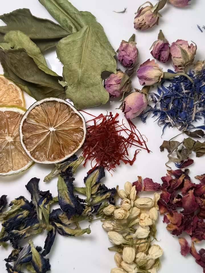 liścia limonki, jaśmin pąki, róża płatki, kwiat klitorii, cytryna, limonka, róża pąki, chaber niebieski, paczula liść, szafran (0,06%)