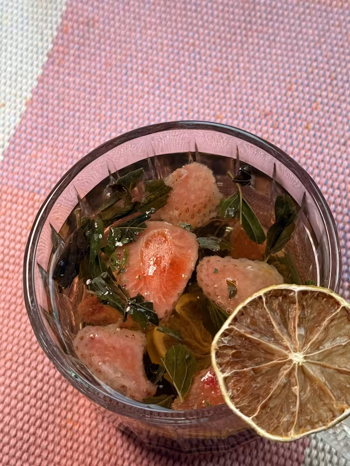 truskawka liofilizowana (35%), limonka, mięta, poziomka liofilizowana.